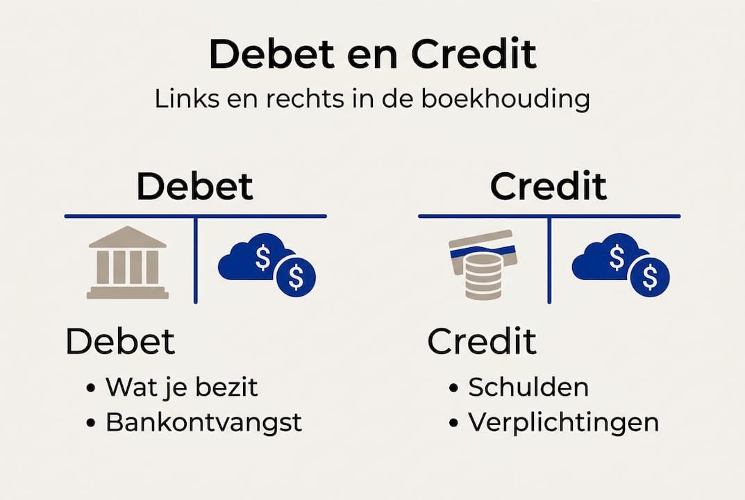 Debet en credit zijn de twee kanten van elke boeking. Debet staat links en geeft aan wat er binnenkomt of wat je bezit. Credit staat rechts en geeft aan waar het geld vandaan komt of wat je verschuldigd bent. Koop je een laptop? Dan boek je de laptop als debet (bezit) en je bankrekening als credit (uitstroom van geld).